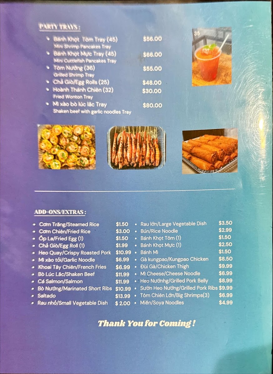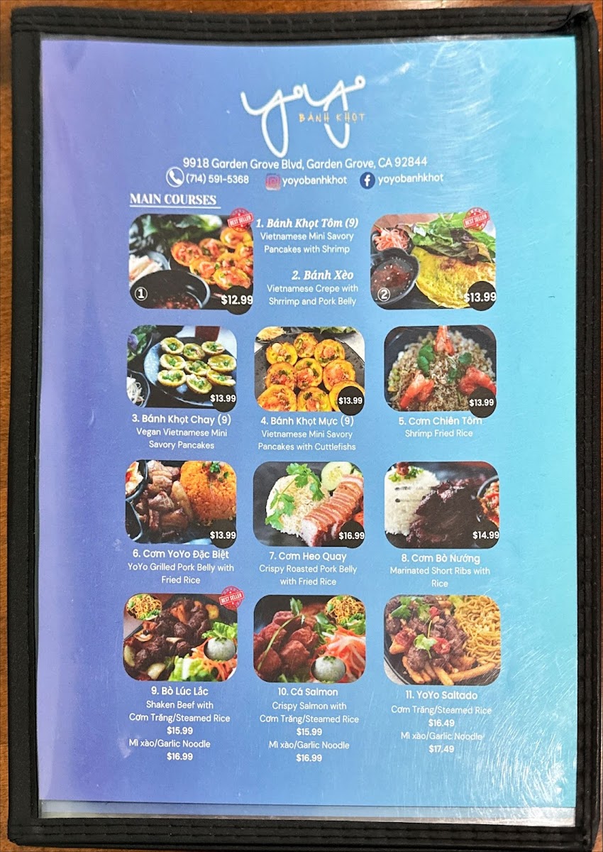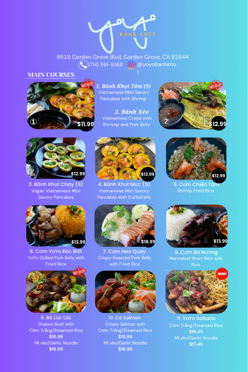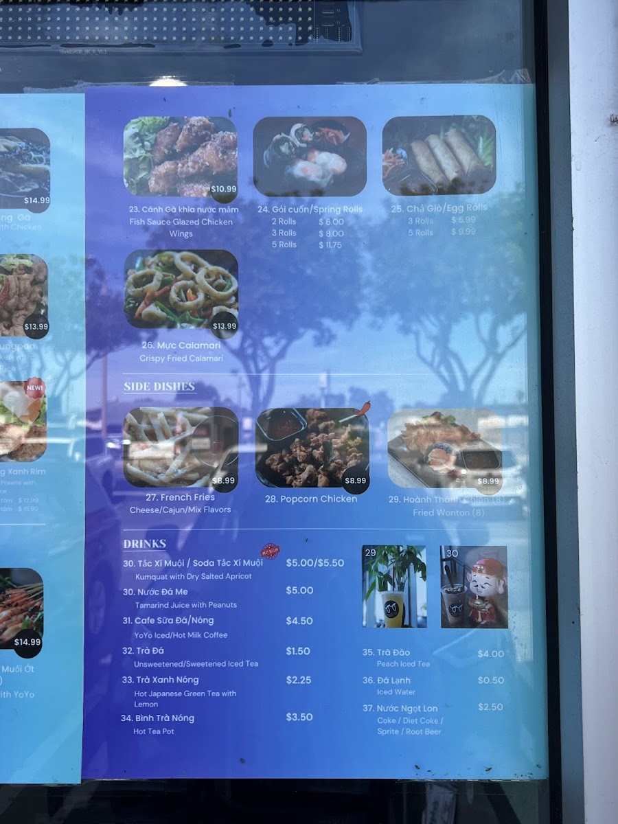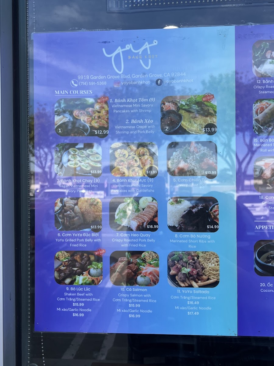 Yoyo Banh Khot’s menu at 9918 Garden Grove Blvd offers a vibrant array of Vietnamese flavors, balancing traditional favorites with creative twists. For main dishes, the highlights include Shaken Beef With Garlic Noodles / Mì Xào Bò Lúc Lắc, Vietnamese Mini Savory Vegan Pancakes / Bánh Khọt Chay, Crispy Roasted Pork Belly With Steamed Rice Vermicelli / Bánh Hỏi Heo Quay, Shaken Beef With Steamed Rice / Cơm Bò Lúc Lắc, and Vietnamese Mini Savory Shrimp Pancakes / Bánh Khọt Tôm, each bringing authentic tastes to the table. Side orders like Popcorn Chicken, French Fries, Fried Wonton / Hoành Thánh Chiên, Spring Rolls / Gỏi Cuốn, and Egg Rolls / Chả Giò complement the mains with familiar yet satisfying flavors. For larger gatherings, the restaurant’s party trays, such as the Mini Cuttlefish Pancake Tray (45pcs) / Bánh Khọt Mực Tray, Mini Shrimp Pancake Tray (45pcs) / Bánh Khọt Tôm Tray, and Shaken Beef With Garlic Noodles Tray / Mì Xào Bò Lúc Lắc Tray, provide convenient and flavorful options. Appetizers like Coconut Milk Escargot / Ốc Len Xào Dừa, Fish Sauce Glazed Chicken Wings / Cánh Gà Khìa Nước Mắm, Grilled Shrimp With YoYo Salt / Tôm Nướng Muối Tôm, and Grilled Snails With Green Onions / Ốc Hương Nướng Mỡ Hành showcase bold and nuanced flavors. Drinks range from simple Warm Water and Ice Tea / Trà Đá to more distinctive choices like Kumquat With Dry Salted Apricot / Tắc Xí Muội and Kumquat With Dry Salted Apricot Soda / Soda Tắc Xí Muội, rounding out the menu with refreshing options. Overall, Yoyo Banh Khot combines authentic Vietnamese dishes with approachable sides and creative appetizers, offering diners a well-curated, flavorful experience that suits both casual meals and festive gatherings.