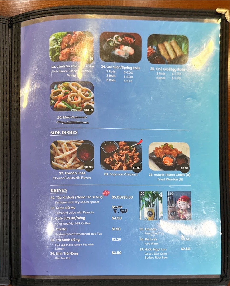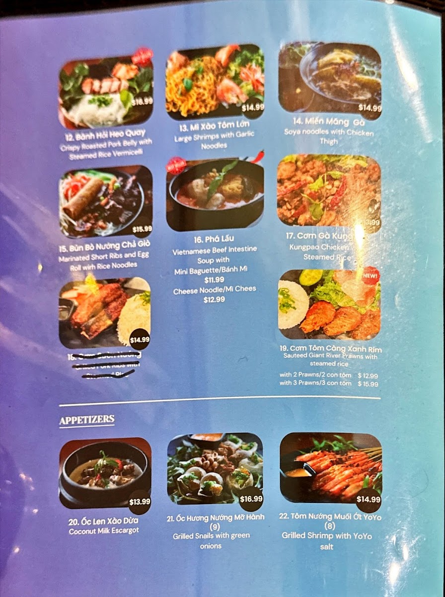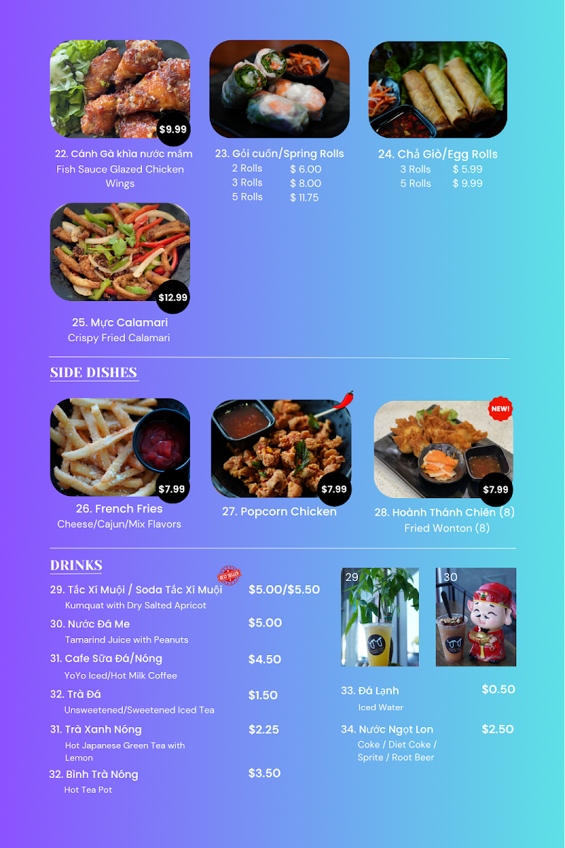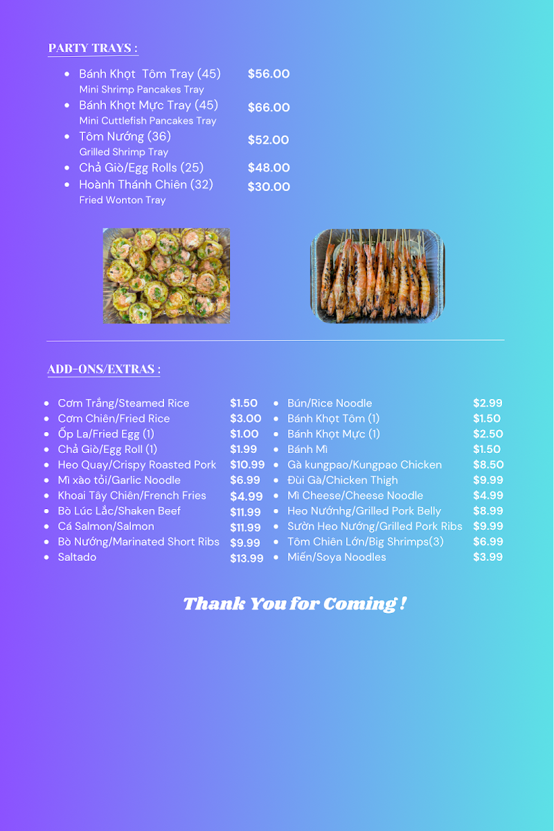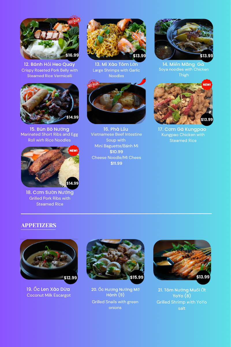 Yoyo Banh Khot’s menu at 9918 Garden Grove Blvd offers a vibrant array of Vietnamese flavors, balancing traditional favorites with creative twists. For main dishes, the highlights include Shaken Beef With Garlic Noodles / Mì Xào Bò Lúc Lắc, Vietnamese Mini Savory Vegan Pancakes / Bánh Khọt Chay, Crispy Roasted Pork Belly With Steamed Rice Vermicelli / Bánh Hỏi Heo Quay, Shaken Beef With Steamed Rice / Cơm Bò Lúc Lắc, and Vietnamese Mini Savory Shrimp Pancakes / Bánh Khọt Tôm, each bringing authentic tastes to the table. Side orders like Popcorn Chicken, French Fries, Fried Wonton / Hoành Thánh Chiên, Spring Rolls / Gỏi Cuốn, and Egg Rolls / Chả Giò complement the mains with familiar yet satisfying flavors. For larger gatherings, the restaurant’s party trays, such as the Mini Cuttlefish Pancake Tray (45pcs) / Bánh Khọt Mực Tray, Mini Shrimp Pancake Tray (45pcs) / Bánh Khọt Tôm Tray, and Shaken Beef With Garlic Noodles Tray / Mì Xào Bò Lúc Lắc Tray, provide convenient and flavorful options. Appetizers like Coconut Milk Escargot / Ốc Len Xào Dừa, Fish Sauce Glazed Chicken Wings / Cánh Gà Khìa Nước Mắm, Grilled Shrimp With YoYo Salt / Tôm Nướng Muối Tôm, and Grilled Snails With Green Onions / Ốc Hương Nướng Mỡ Hành showcase bold and nuanced flavors. Drinks range from simple Warm Water and Ice Tea / Trà Đá to more distinctive choices like Kumquat With Dry Salted Apricot / Tắc Xí Muội and Kumquat With Dry Salted Apricot Soda / Soda Tắc Xí Muội, rounding out the menu with refreshing options. Overall, Yoyo Banh Khot combines authentic Vietnamese dishes with approachable sides and creative appetizers, offering diners a well-curated, flavorful experience that suits both casual meals and festive gatherings.